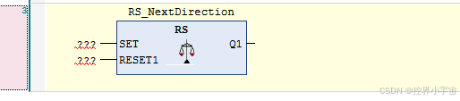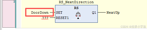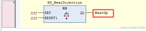 - 添加 RS 功能块:实例名设为"RS_NextDirection",输出端连接"NextUp"。