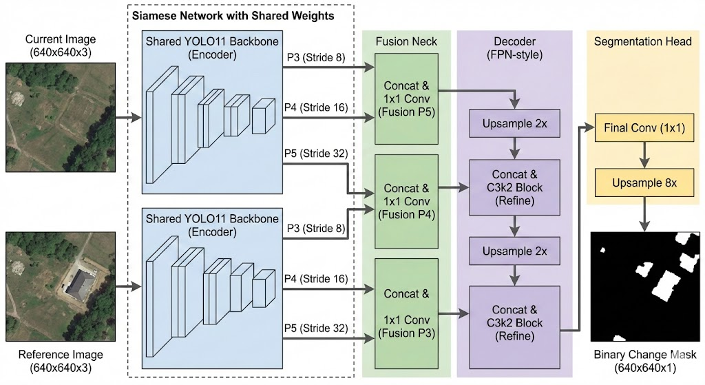 为了解决这些问题,我们采用了 Deep Learning Change Detection 的思路,并选择了当前 SOTA 的 YOLO11s 作为特征提取器。