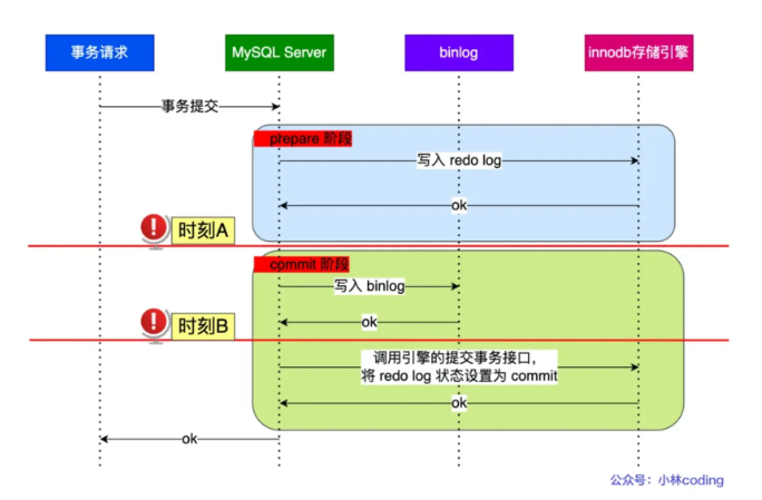 在A时刻,从binlog中没有当前内部XA事务的XID,说明redolog完成刷盘,binlog没有,就回滚事务