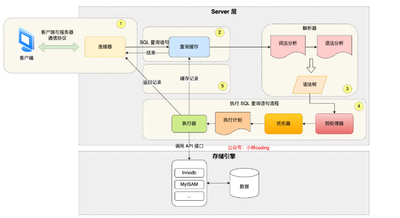 执行阶段:根据执行计划执行 SQL 查询语句,从存储引擎读取记录,返回给客户端;