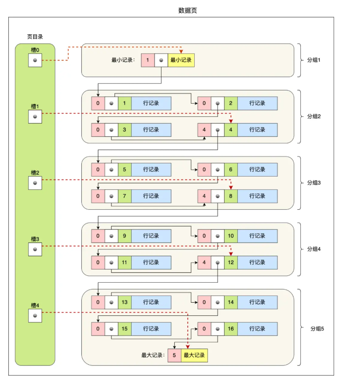 在查找时,叶子结点里存储了多条记录,按照主键顺序组成单向链表。为了加快查找速度,将记录分组,同时设置一个页目录,页目录中有多个槽指向每一页的最后一条记录。通过二分查找,找到对应槽,在遍历槽下的所有记录。