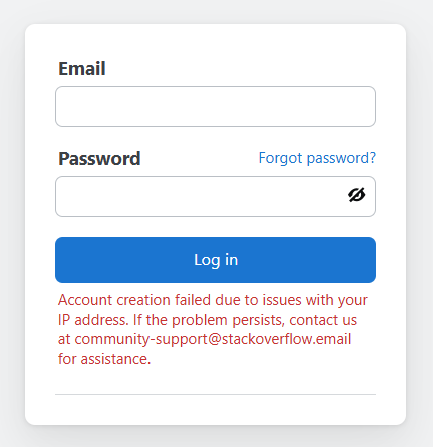 Account creation failed due to an issue with your IP address. If the problem persists, please contact us at community-s Something went wrong. Please contact us at community-support@stackoverflow.email fo...
