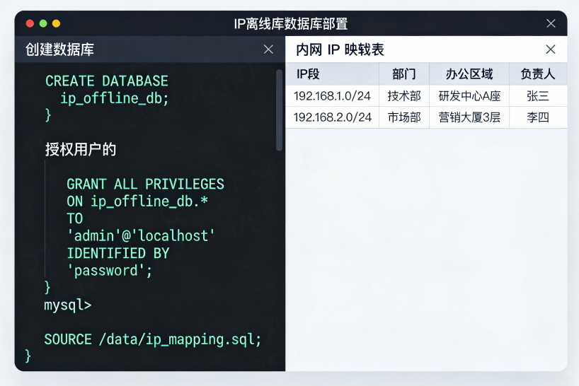 ) COMMENT '内网IP段自定义映射表';导入内网IP规划数据:将企业内网IP规划表(Excel格式)转换为SQL导入脚本,执行导入(示例:192.168.1.0/24段归属研发部):INSERT INTO internal_ip_map (ip_start, ip_end, department, office_area, device_owner)