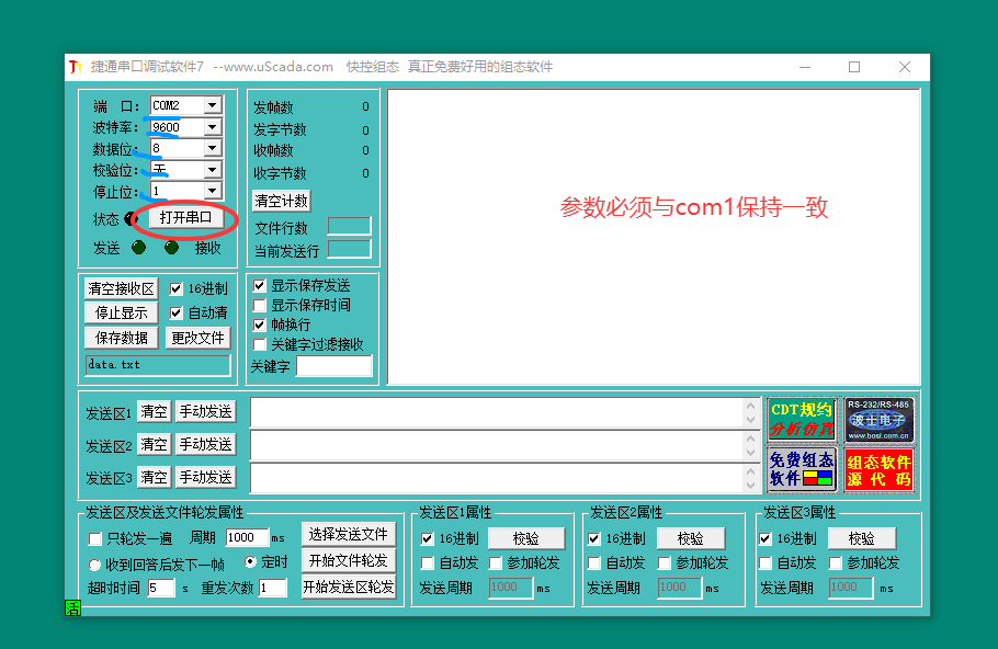 可设置波特率、数据位、停止位、校验位等串口参数。