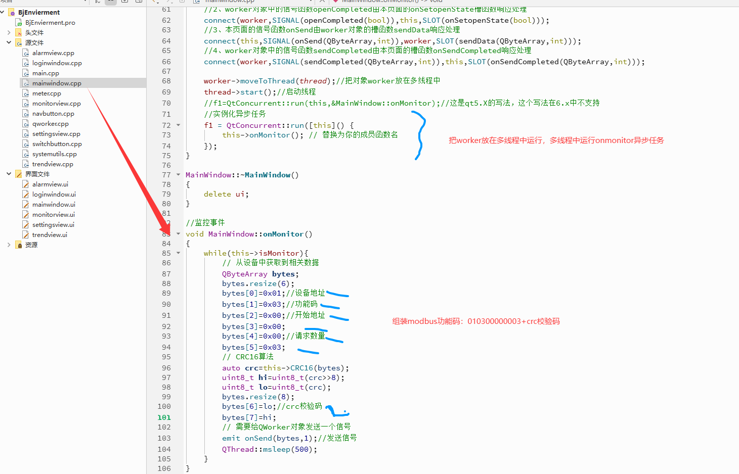 本节内容较多较复杂,重点是modbus功能码,另外是工具软件的使用,还有QT的异步,多线程知识,下节解析报文,并显示到界面上。