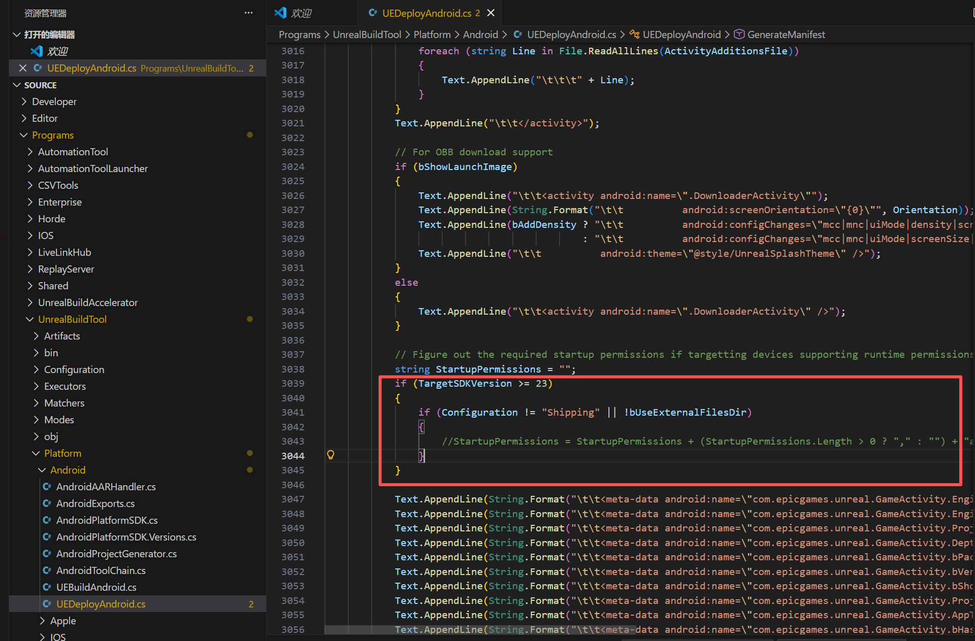 UE5.6引擎的发布版本去注释那串源代码无效,如果就是想打包测试一下效果,临时打开发包,可以使用adb直接给app权限