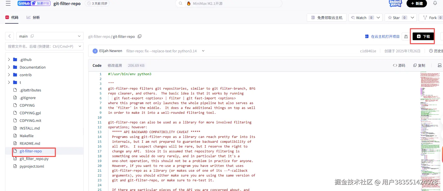 1. 从git-filter-repo的GitHub页面下载最新版本的git-filter-repo,它是一个单文件的Python脚本。