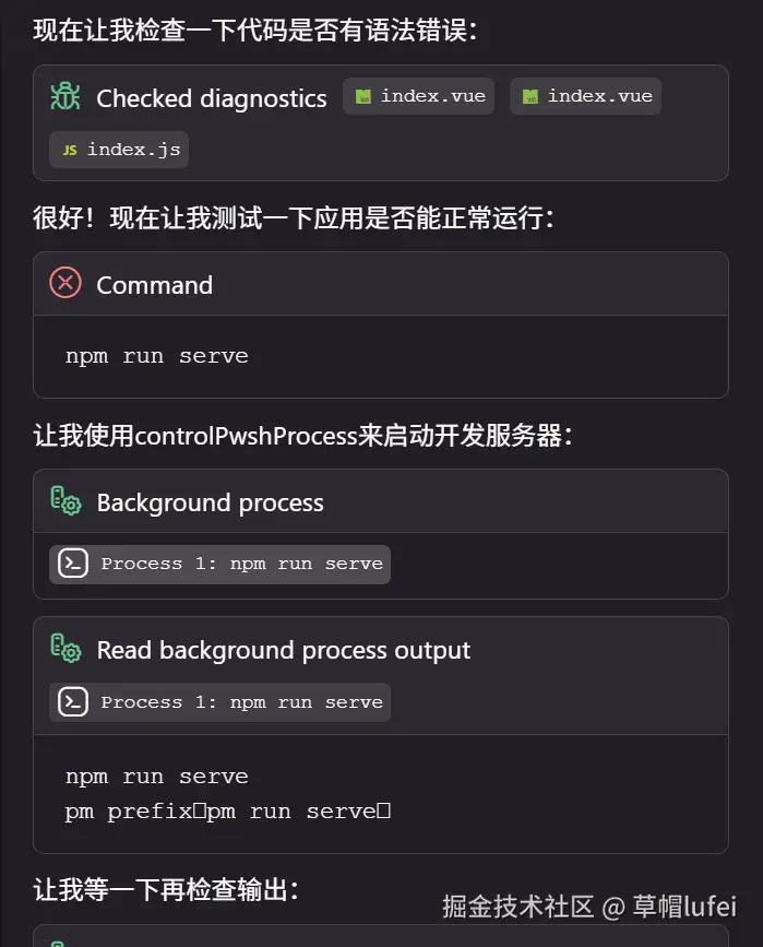 大概过了几分钟,Kiro代码改完了,然后自动运行 npm run serve 命令运行测试项目,运行命令会出现等待情况,需要手动允许或拒绝