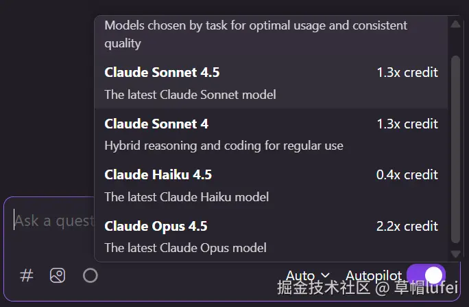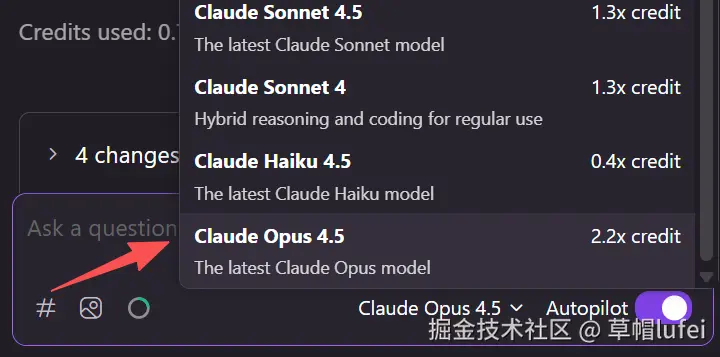 把模型从自动改为消耗积分最多的 Claude Opus 4.5,积分消耗为自动模式的 2.2 倍,看看会不会明显提高效率