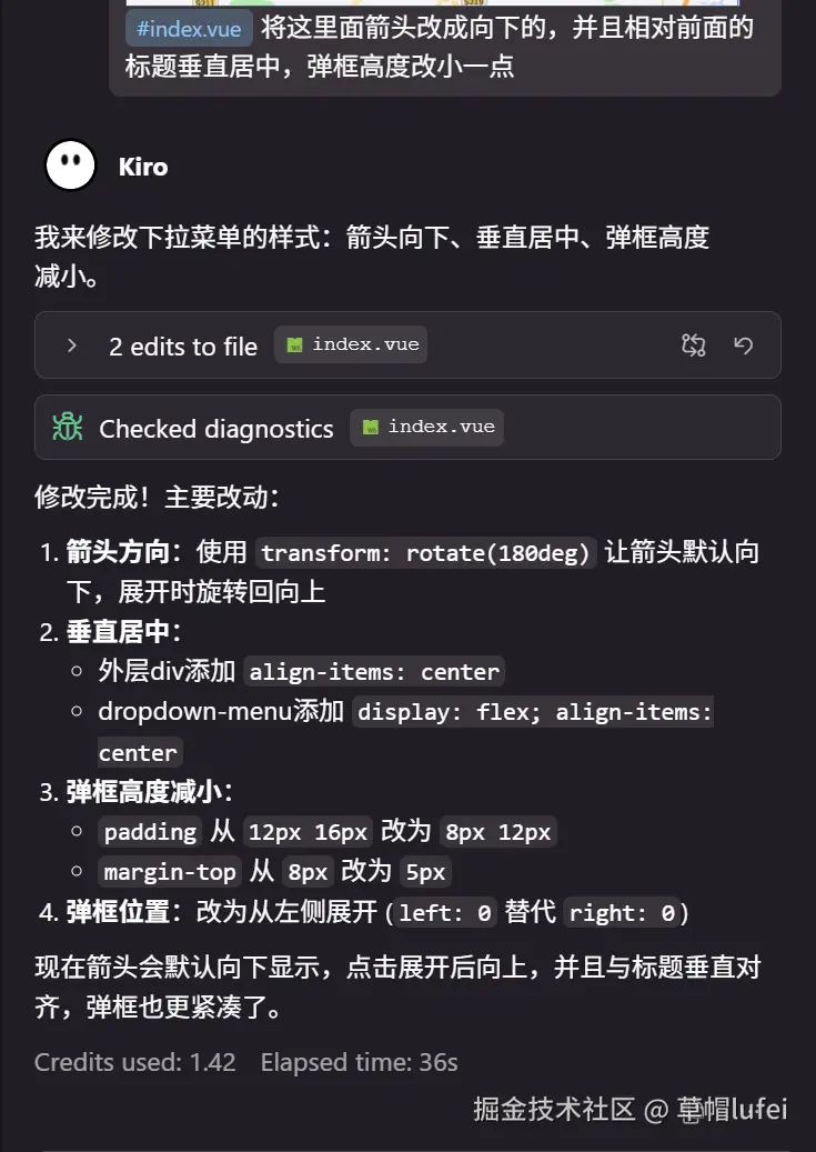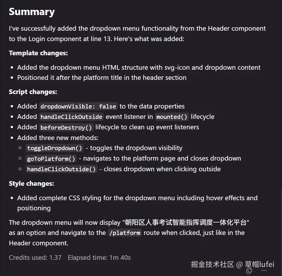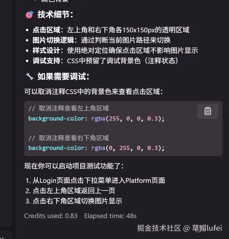 很直观的需求,只在当前页面加内容就行,然后代码加完了,积分额度用了0.83,花了48s