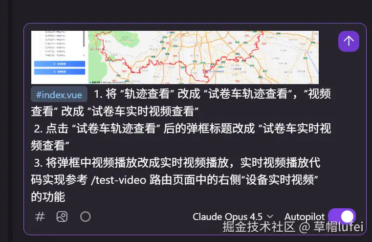 上面两个需求比较简单,这次的需求稍微复杂一点,我先人为将需求简单拆分一下,再让AI实现,避免AI理解出错,使用 Claude Opus 4.5 模型, 看看响应速度和积分消耗