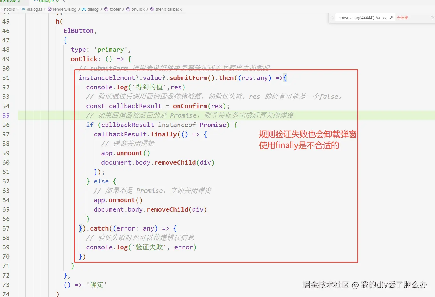 眼尖的小伙伴可能已经发现了这一段代码。 1,验证不通过会也会触发卸载弹窗 2,callbackResult.finally是不合适的