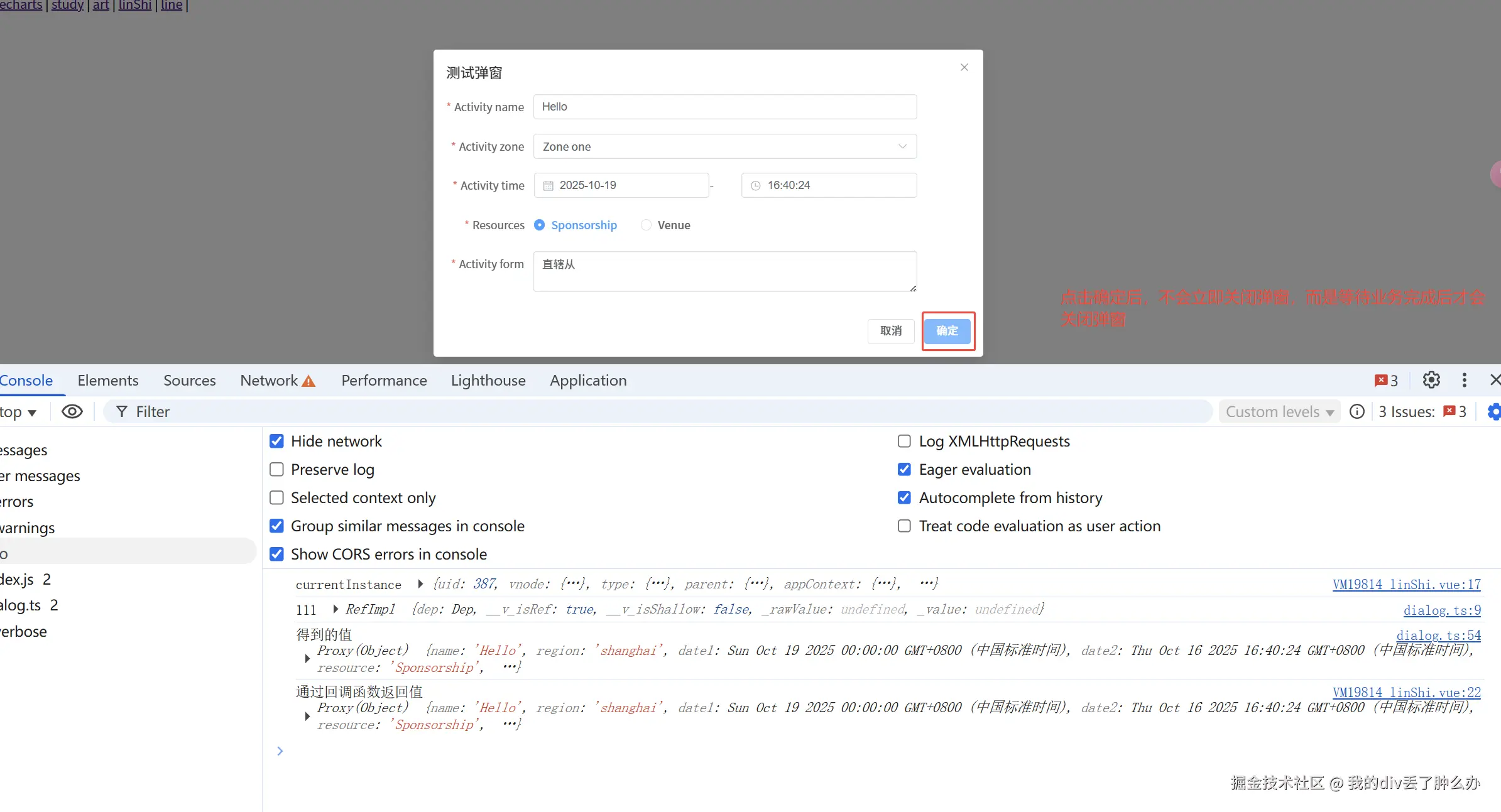 现在想要点击确定,等业务处理完成之后,才关闭弹窗。 需要在使用完成业务的时候返回一个promise,让封装的弹窗调用这个promise 这样就可以知道什么时候关闭弹窗了