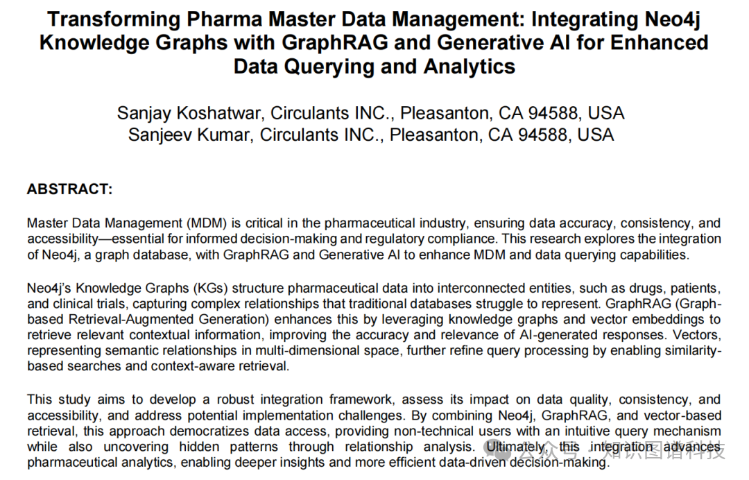 本研究证明,Neo4j、GraphRAG与生成AI的整合重塑了制药MDM,提供更智能的数据生态。 关键启示: