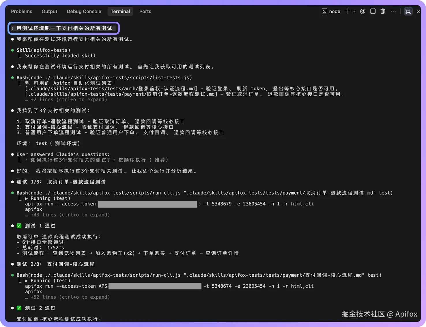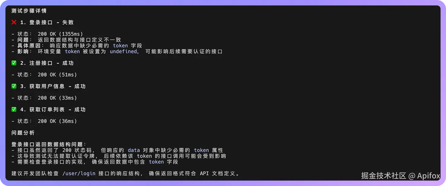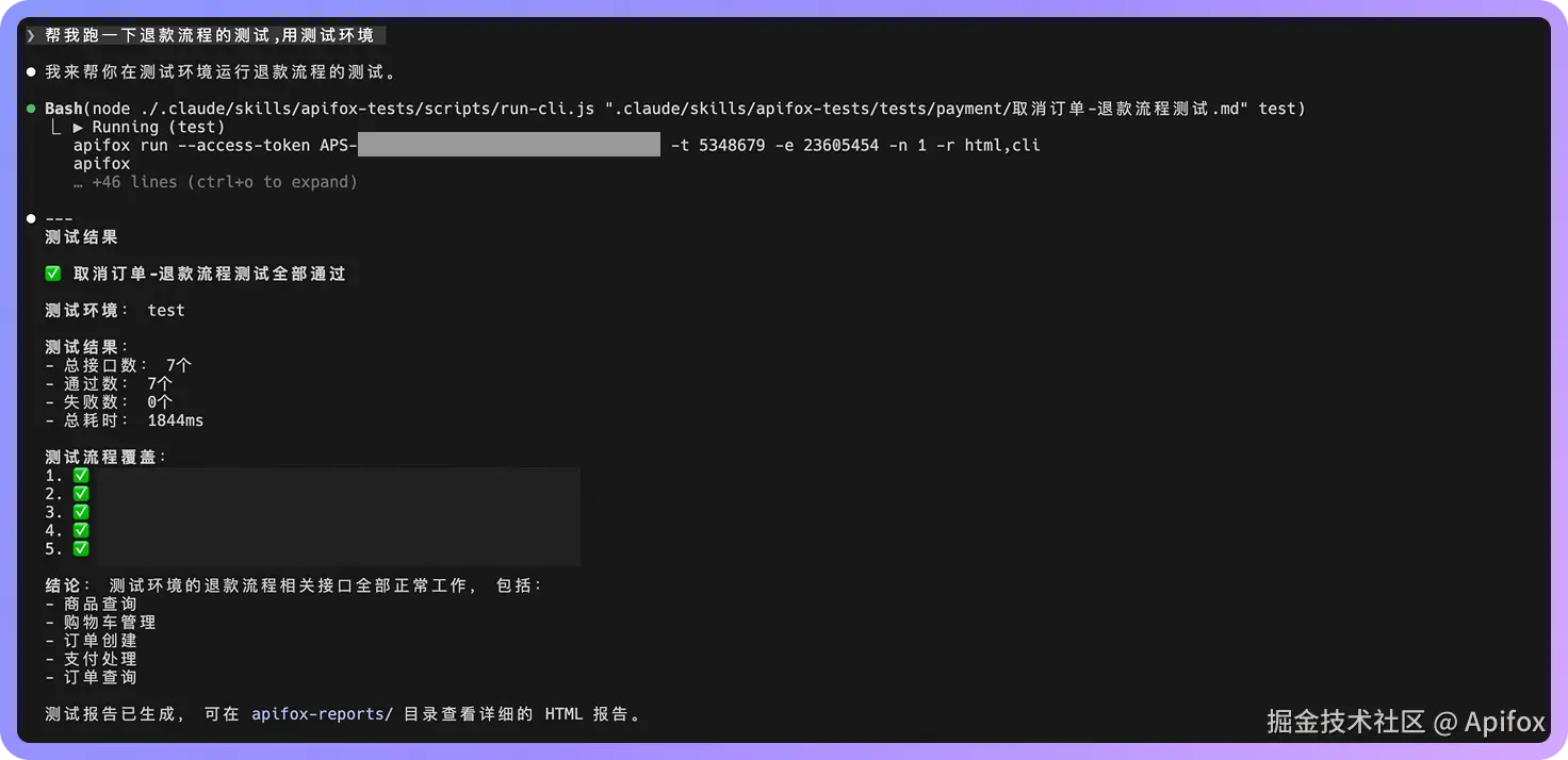 看到测试输出就说明 Apifox CLI 能正常工作了。