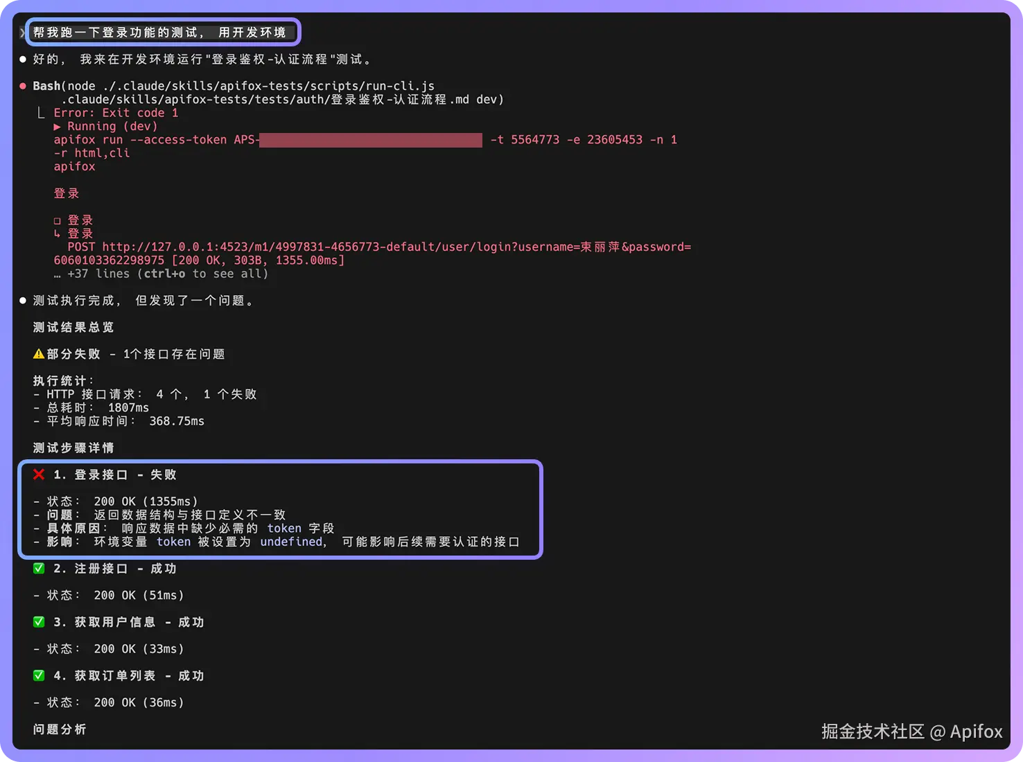 Claude 会理解你的意图,找到对应的测试文件并执行测试。在执行过程中,你会看到 Apifox CLI 的输出;测试完成后,Claude 会对结果进行分析并给出总结。