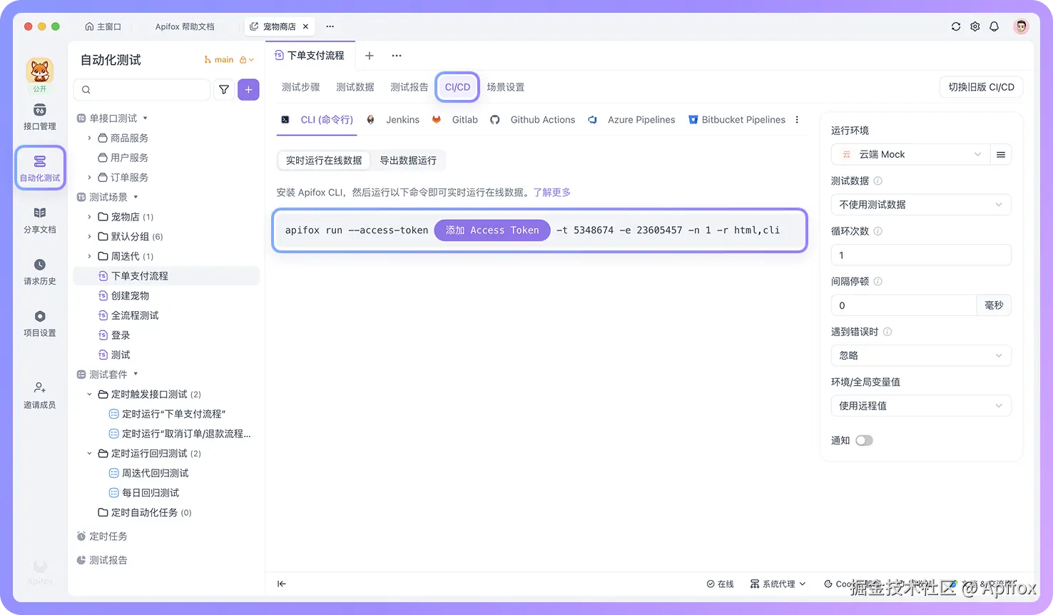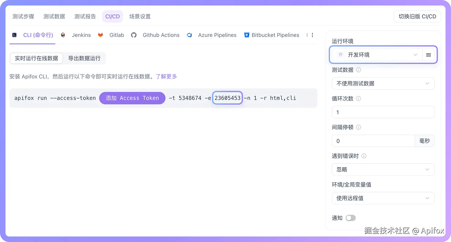 可以到 Apifox 的「自动化测试 -> CI/CD」中,复制一个"测试场景"或者"测试套件"的 CLI 命令到终端执行,记得添加 Access Token。