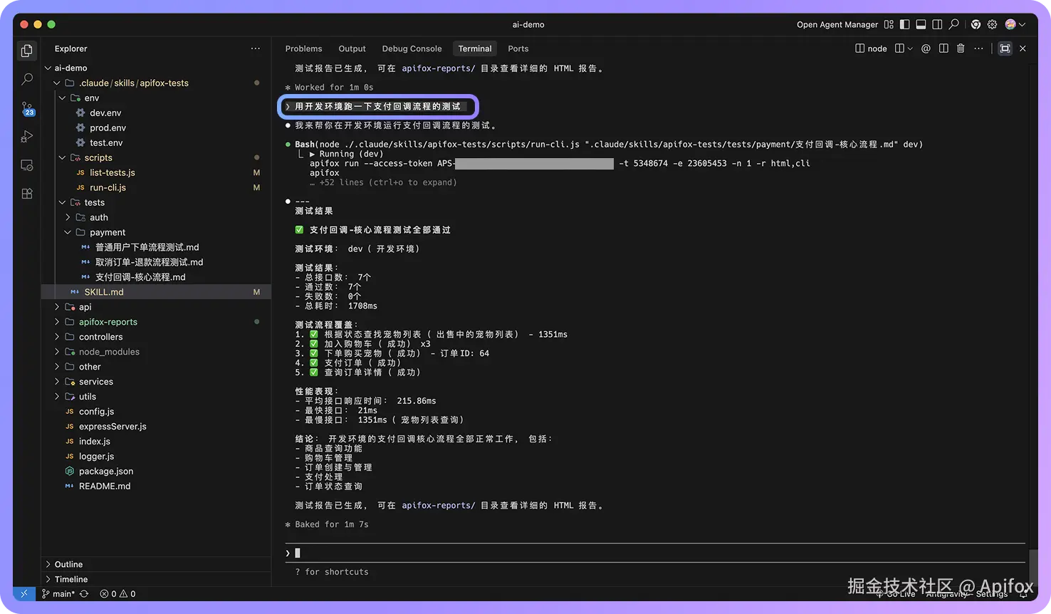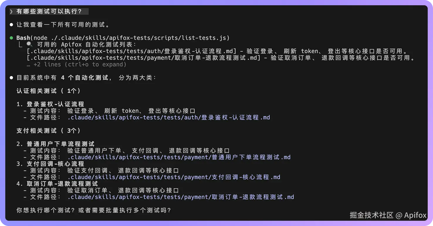 整个流程概述起来就是,你用自然语言描述需求,Claude 理解意图并调用脚本,脚本执行 Apifox CLI 命令,Claude 分析结果并反馈给你。