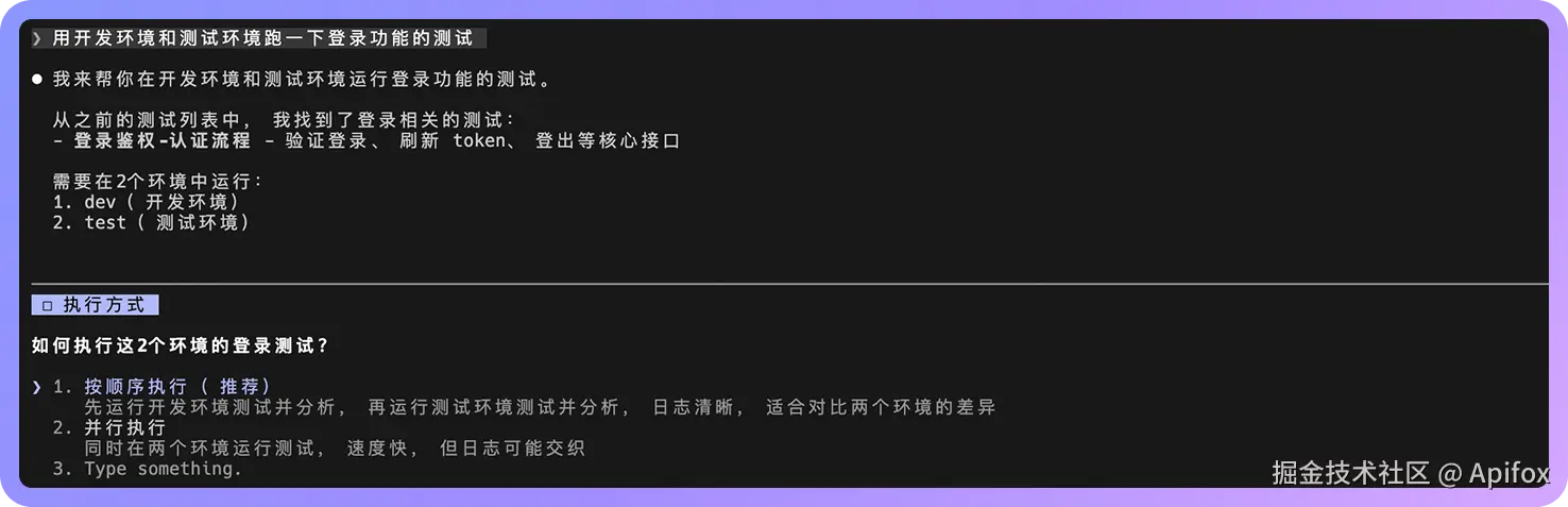 如果想执行特定的测试场景,可以直接指定。例如,在 Claude Code 输入:"帮我跑一下登录功能的测试,用开发环境",测试完成后 Claude 会分析结果并给出总结。