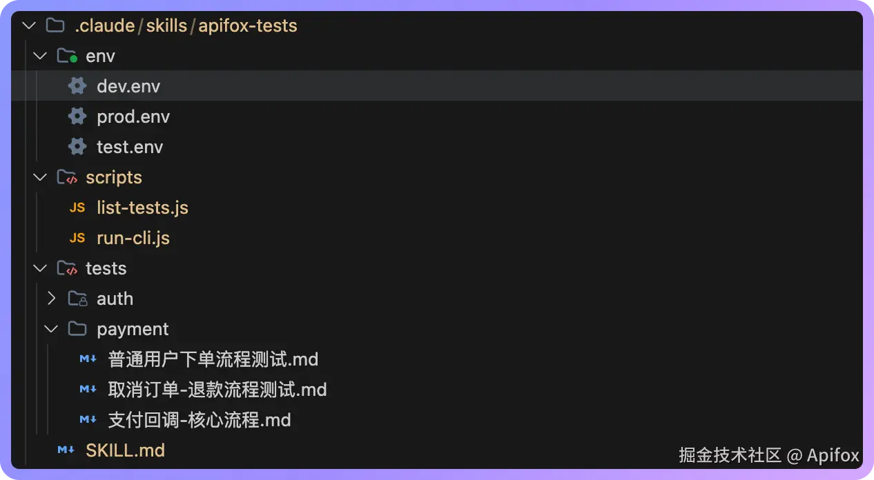在这里,我们在项目根目录下,为 Apifox 自动化测试创建一个最小可用的 Skill 目录: