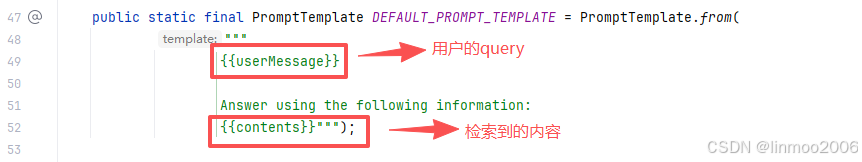 ContentInjector 负责将 ContentAggregator 返回的内容注入到 UserMessage 中。Langchain4j 中默认实现DefaultContentInjector类,其就是通过一个promptTemplate提示词模版,将用户的qurey和检索到的content组装在一起: