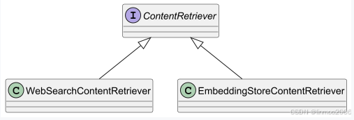 Langchain4j 中定义了一层抽象的查询器,会根据给定的查询从底层数据源中获取内容。底层数据源几乎可以是任何东西,比如embedding存储、全文搜索引擎、向量与全文搜索的混合体、网络搜索引擎、知识图谱、SQL 数据库等等。在Langchain4j 中ContentRetriever的默认实现类如下: