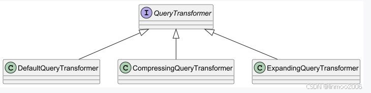 以上关于问题优化,大家可以参考我之前写的《检索增强生成RAG系列4--RAG优化之问题优化》这篇文章。另外也可以看看langchain4j的官方网站的这篇blog《Query Transformations》。而在Langchain4j 中是通过QueryTransformer接口来实现这个功能,该接口默认实现类如下:
