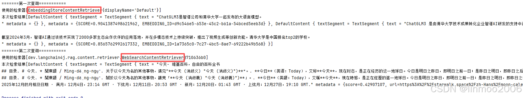 说明:可以看到第一次大模型判断使用EmbeddingStoreContentRetriever,而第二次大模型判断使用WebSearchContentRetriever。(这个取决于大模型的判断能力,而且不一定每一次都是一样的,需要不断通过提示词提高或优化,或者直接使用微调过的模型)