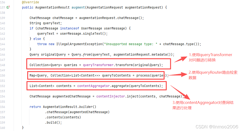 RetrievalAugmentor是Langchain4j 定义的RAG的管道的Retrieval入口点。它负责用从各种来源检索到的相关内容来扩充ChatMessage。默认中有一个DefaultRetrievalAugmentor实现类,该类在前面《Langchain4j 系列之十七 - RAG入门》中3.2 Retrieval:查询文档 分析其底层原理,主要是augment()方法,如下图: