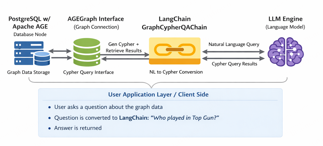 用户在 应用层 提出自然语言查询。该问题首先传入 LangChain 的 GraphCypherQAChain ,链内部调用 LLM 引擎 将自然语言自动转换为 Cypher 查询语句 。生成的 Cypher 查询通过 AGE图实例 (AGEGraph)发送到 PostgreSQL + Apache AGE 图数据库 执行,检索出对应的图结构数据(节点、关系及属性)。数据库返回的结果再次由 LLM 解析和整理,最终以自然语言答案的形式返回给用户。