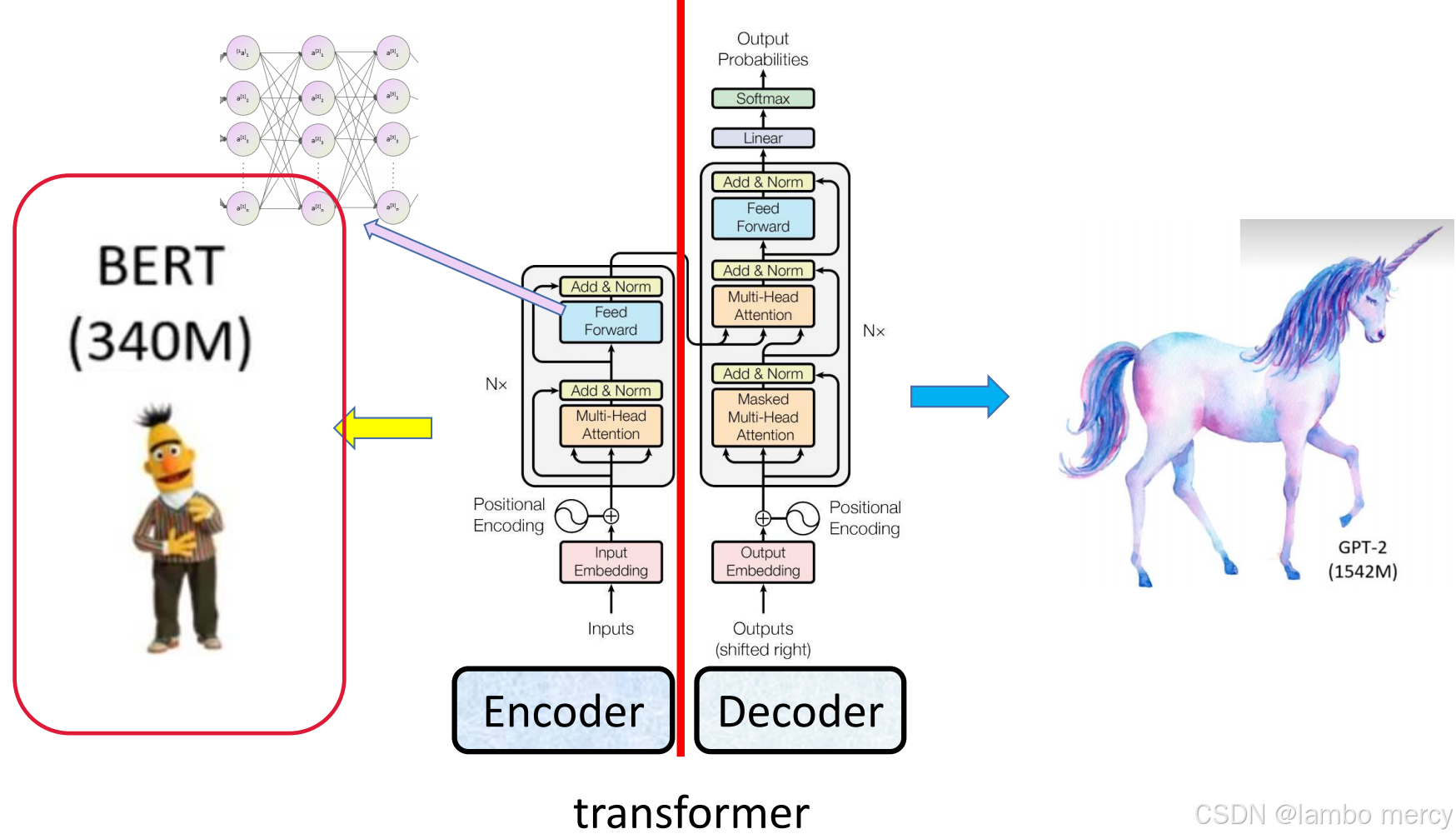 - 图左侧的编码器模块对应BERT(340M 参数),BERT 基于 Transformer 的编码器构建,采用双向的 Masked Multi-Head Attention,因此擅长文本理解类任务(如语义分类、实体识别)。
