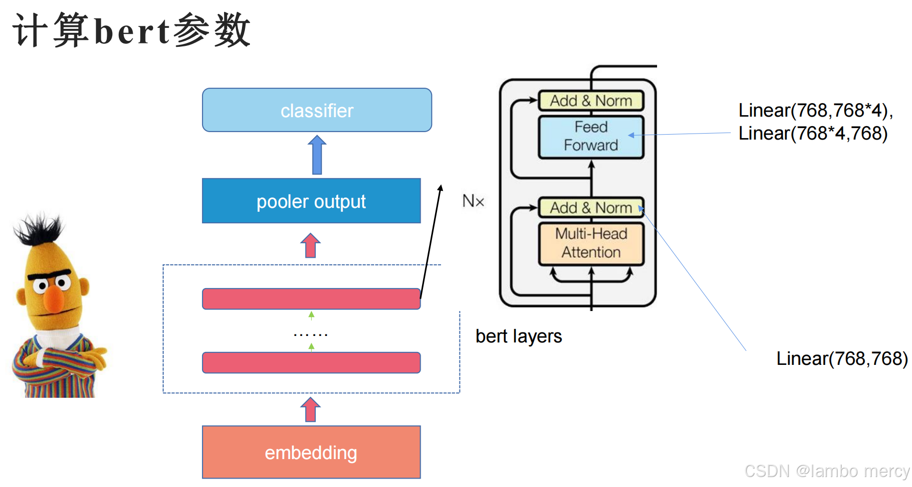 - BERT 层(bert layers):重复 N 次的 Transformer 编码器模块(图中 "N×" 表示重复),是 BERT 语义建模的核心;