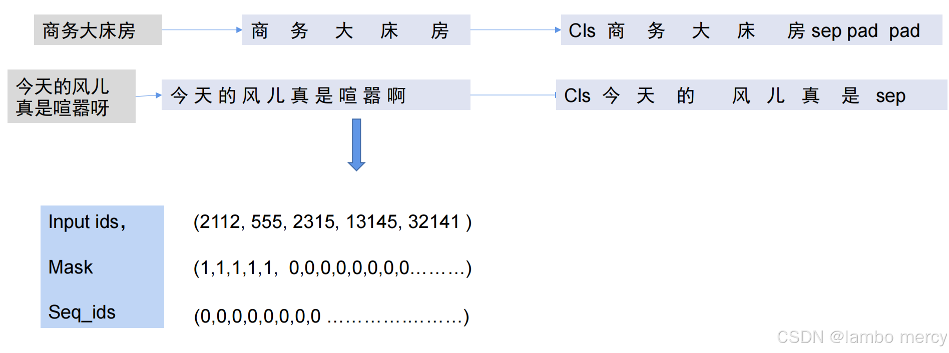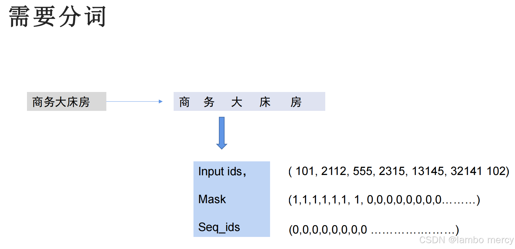 - 分词:将连续文本 "商务大床房" 拆分为基础单元(此处为单个汉字 "商、务、大、床、房")。
