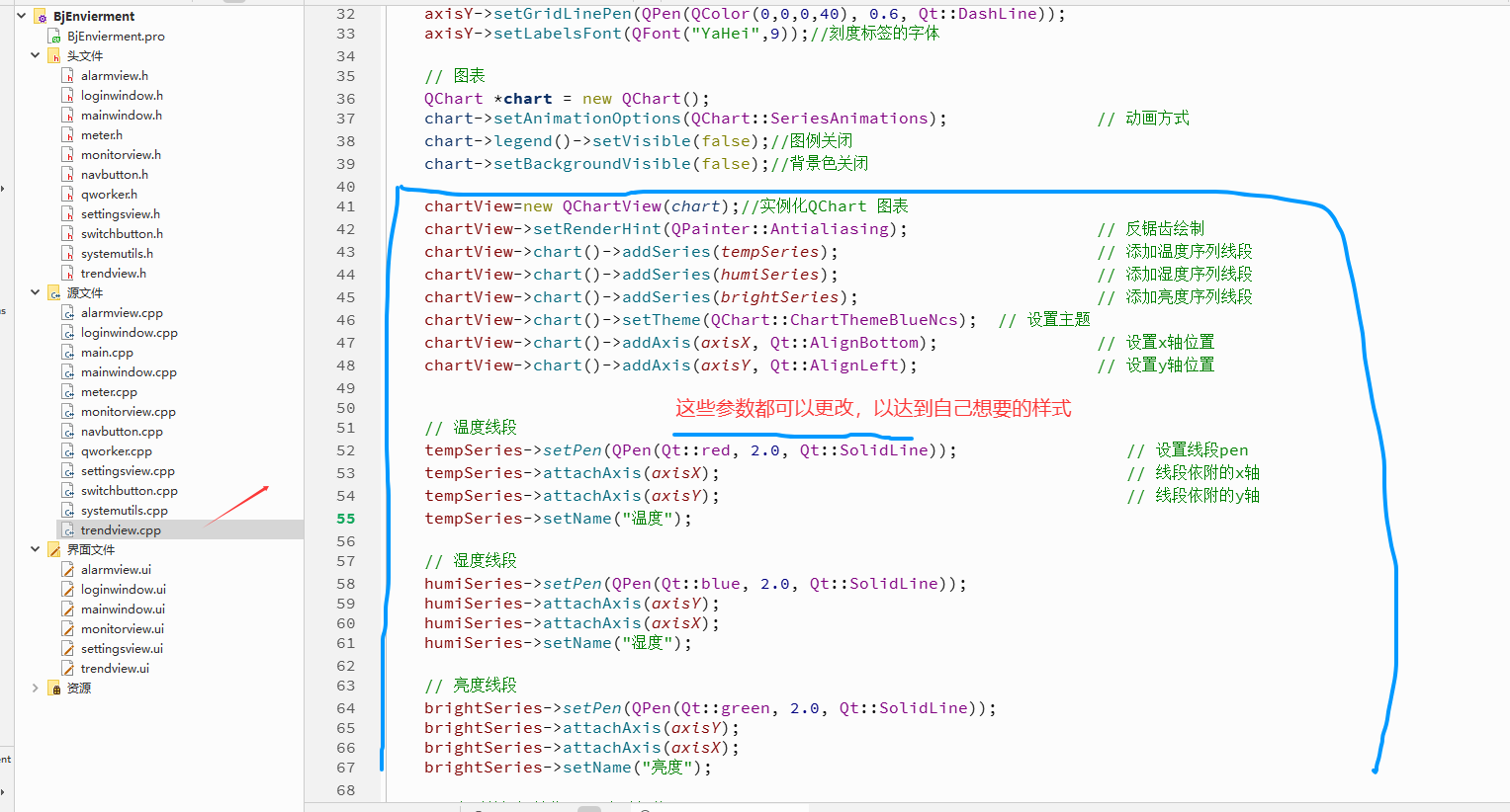 chartView->chart()->addSeries(humiSeries); // 添加湿度序列线段