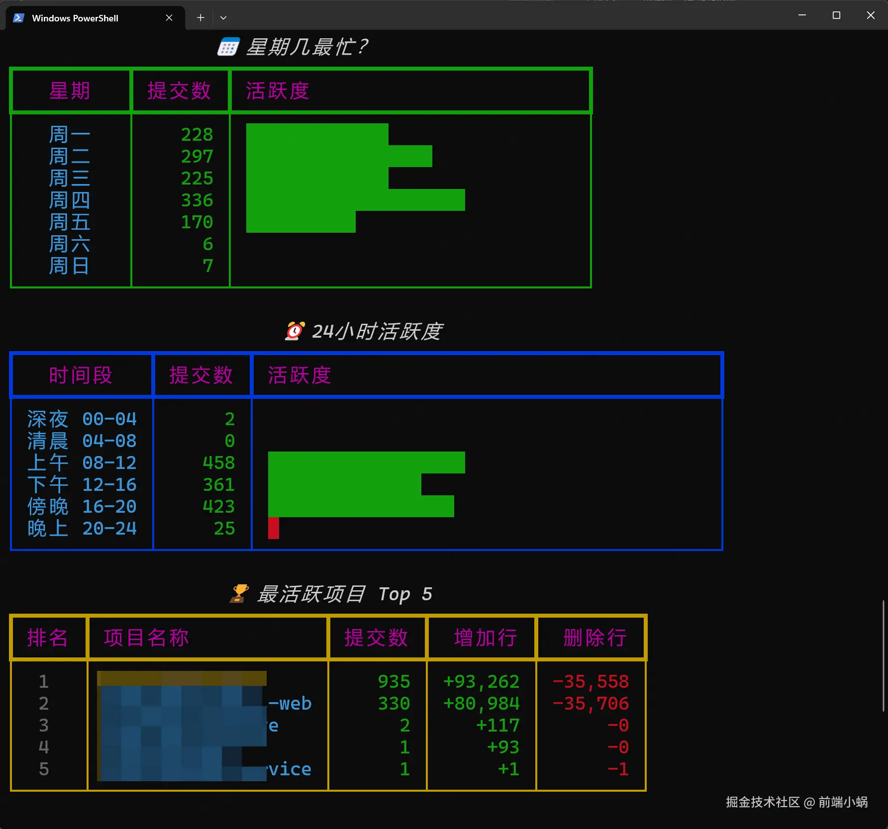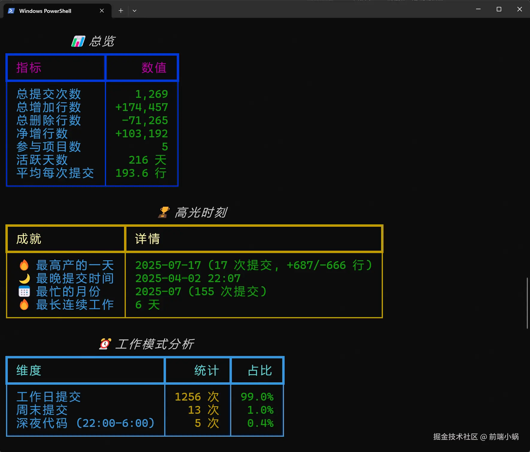 - 摸鱼鉴定:统计了周末提交和深夜代码的比例。看着 25% 的周末提交占比... 算了,都是泪。