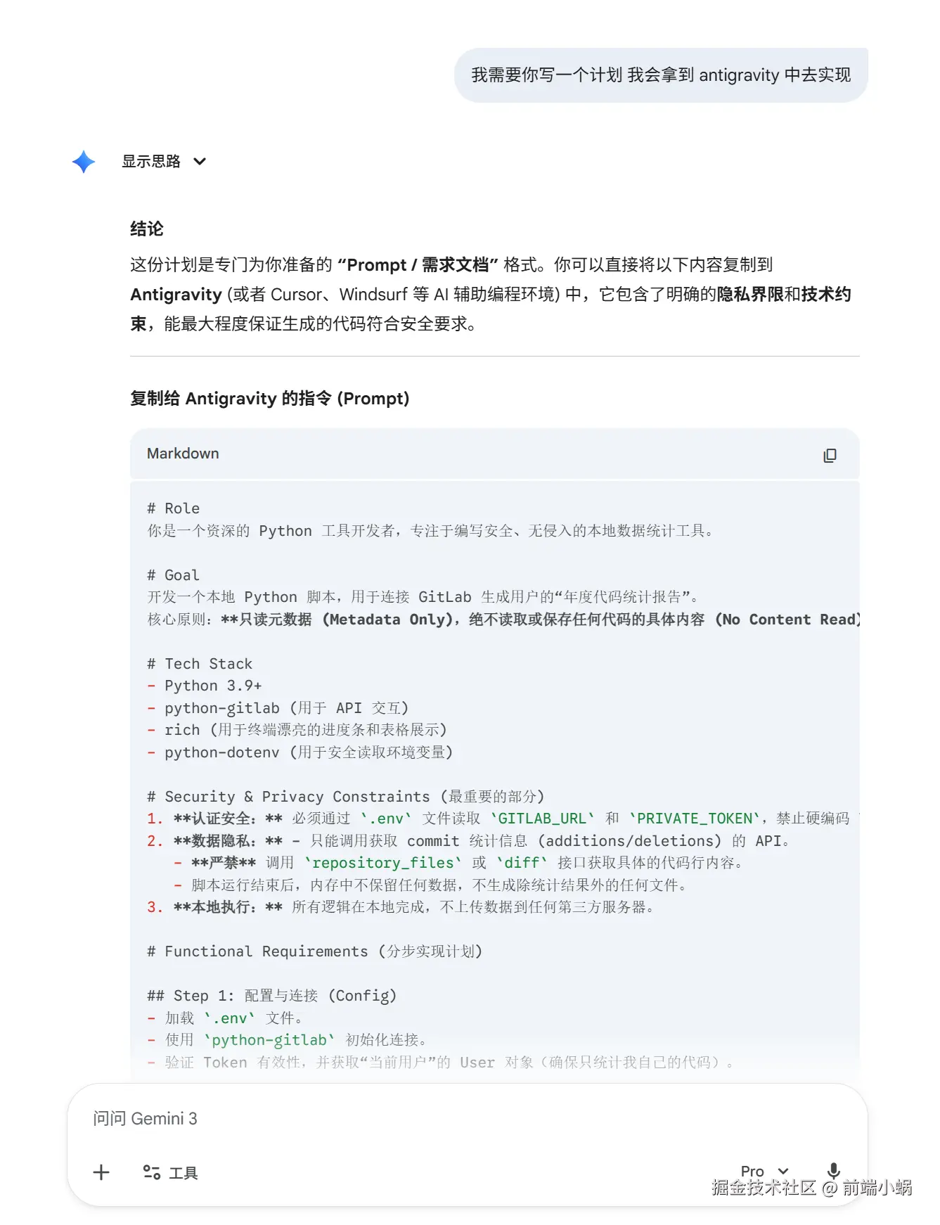 我反手就是一个 Prompt 甩过去,着重强调了我的 "安全洁癖" :必须只通过 .env 读 Token,严禁调用 repository_files 这种危险接口。