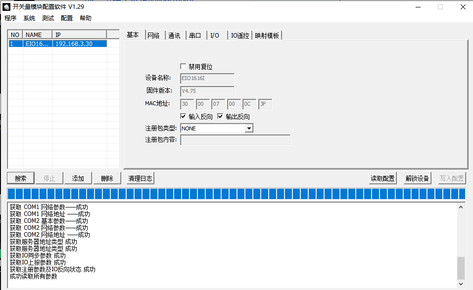 1.打开EIOCfg(开关量模块配置软件),点击搜索,获取到采集器的ip.