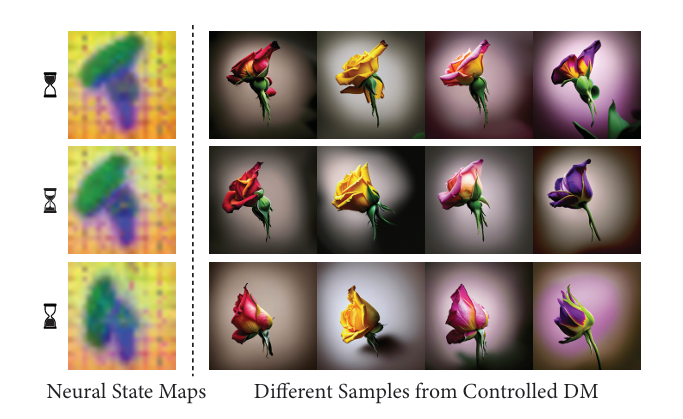 左侧展示神经状态图(DINOv2 特征可视化结果),右侧为相同状态图条件下生成的多样本图像。结果表明,神经状态图同时编码了 "对象生命周期阶段"(时间信息)与 "观察视角"(空间信息),在固定时间状态下,生成样本可保持生命周期一致性的同时,具备外观多样性。这证明神经状态图是一种精准的 "时间 × 视角" 条件控制信号,而非普通噪声或时间步长参数。