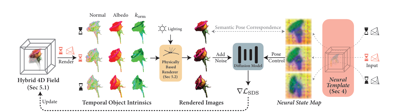 首次实现从 2D 扩散模型中蒸馏出具备 4D 一致性的物体内禀属性。此前 SDS(Score Distillation Sampling)及各类 4D 生成方法普遍面临两大难题:空间视角不一致的 Janus 问题,以及时间维度上的状态重复(temporal collapse)。为此,研究设计 "神经模板(Neural Template)+ 神经状态图(Neural State Map)" 的双核心机制,通过显式建模解决 "视角 - 时间" 双重歧义,为 4D 生成提供了稳定的约束框架。 - 神经模板:4D 蒸馏的核心锚定机制