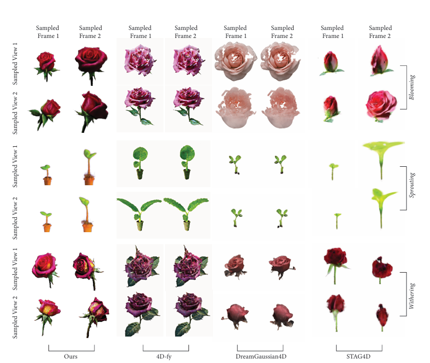 该研究方法:在时间变化的自然度、多视角一致性上均表现最优,核心优势在于实现了 "生命周期级的真实变化",而非传统方法的 "表面动态效果"。