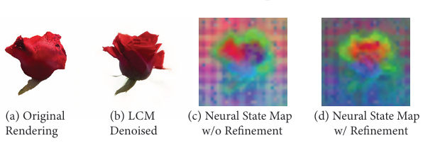 首先通过视频扩散模型采样目标对象的参考视频序列(如玫瑰绽放过程),经 4D 重建得到粗糙的动态网格模型(dynamic mesh);对该网格模型进行渲染后,利用一致性模型(consistency model)完成去噪处理;将去噪后的渲染结果输入 DINOv2 模型提取特征,并通过 PCA 降维生成神经状态图(Neural State Map)。最终形成映射关系:T (视角 ξ, 时间 t) → 神经状态图,其核心作用是为系统提供 "当前对象所处生命周期阶段" 的精准判断依据。