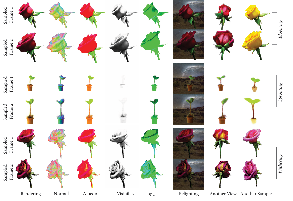 展示了三类自然生命周期过程的生成结果:开花(Blooming)、发芽(Sprouting)、枯萎(Withering)。每个案例均呈现法线图(Normal)、漫反射率(Albedo)、形态可见性(Visibility/Form)、重光照效果(Relighting)、新视角渲染(Novel View)及多样本(Another Sample)。结果验证了该方法对不同自然生命周期过程的泛化能力,同时证明生成结果在几何合理性、材质一致性、时间连续性及可重光照性上均达到高质量标准,实现了 "通用型时间演化物体内禀属性生成",而非特定对象(如玫瑰)的专属方案。