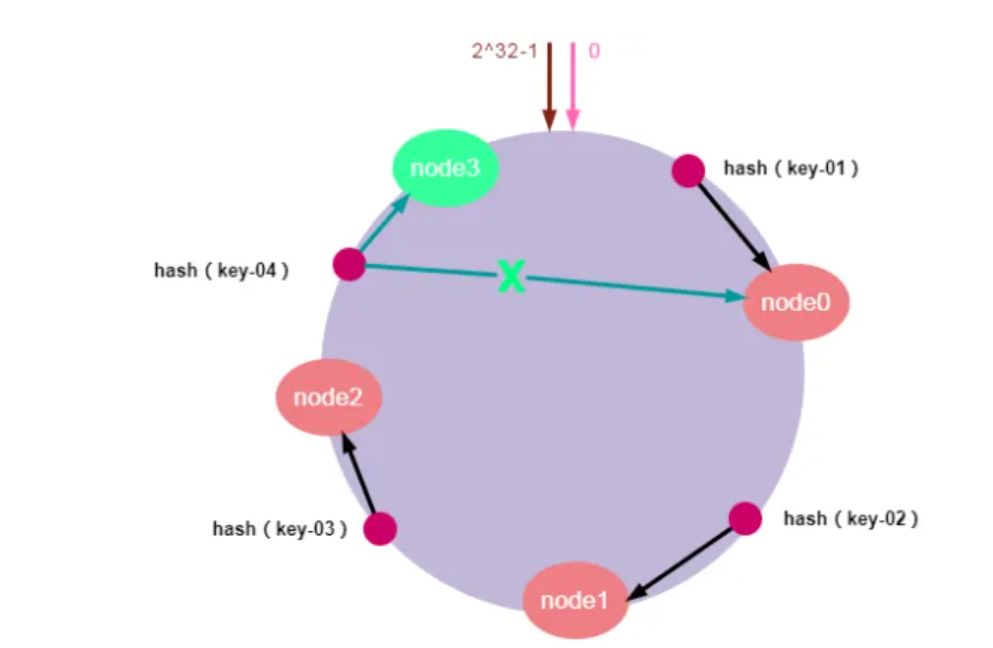 如上图所示,加入新的node3节点后,key-01、key-02不受影响,只有key-03的寻址被重定位到新节点node3,受影响的数据仅仅是会寻址到新节点和前一节点之间的数据。