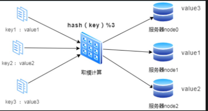如上图所示,首先对key进行hash计算后的结果对3取模,得到的结果一定是0、1或者2;然后映射对应的服务器node0、node1、node2,最后直接找对应的服务器存取数据即可。