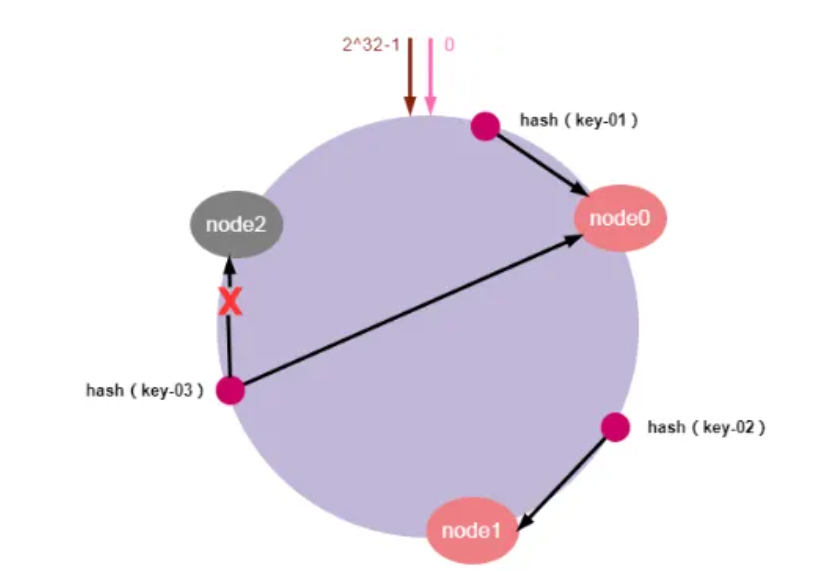 如上图所示,通过哈希计算后,key-01顺时针寻找将找到node0,key-02顺时针寻找将找到node1,key-03顺时针寻找将找到node2。最后,请求找到的服务器节点执行具体的业务操作。