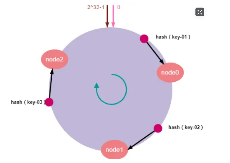 * 规则:计算key的哈希值 → 找哈希环上顺时针最近的虚拟节点 → 映射到物理节点
