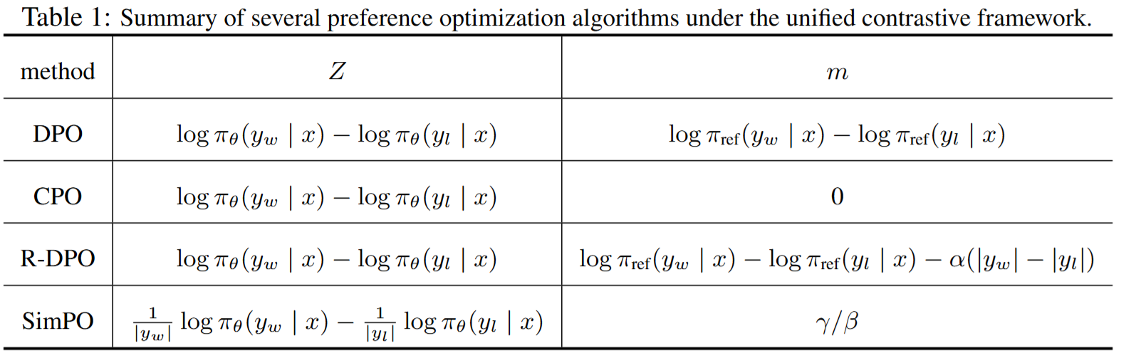 - SimPO同ORPO都没使用参考模型。SimPO主要引入了两个重要部分:一个是使用了长度归一化的奖励值,不同于DPO使用序列级的log probability,SimPO使用token-level的log probability;第二个是把偏好样本奖励值的差值放进了目标函数中,期望chosen样本和rejected样本奖励值的差值越大越好