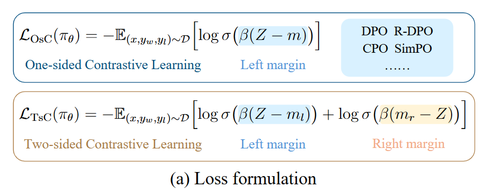 论文指出DPO、CPO、SimPO都属于单边对比学习,这类方法会持续地将chosen样本的概率预测拉向1,rejected样本拉向0,这通常对分类样本是有效的,但是对生成模型来说意味着分布过度尖锐,丧失语言多样性和稳定性。