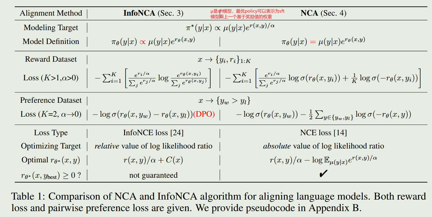 - InfoNCA方法:将reward softmax当做软标签,即 s o f t m a x ( r e w a r d / α ) softmax(reward/\alpha) softmax(reward/α)。把模型学习到的隐式的reward当做logits,计算交叉熵,并作为InfoNCA的损失函数。隐式reward是类似DPO中的对数似然比 r θ = β l o g ( π θ ( y ∣ x ) / μ ( y ∣ x ) ) r_\theta=\beta log(\pi_\theta(y|x)/\mu(y|x)) rθ=βlog(πθ(y∣x)/μ(y∣x))。当K=2, α \alpha α趋近于0时,InfoNCA退化成DPO。