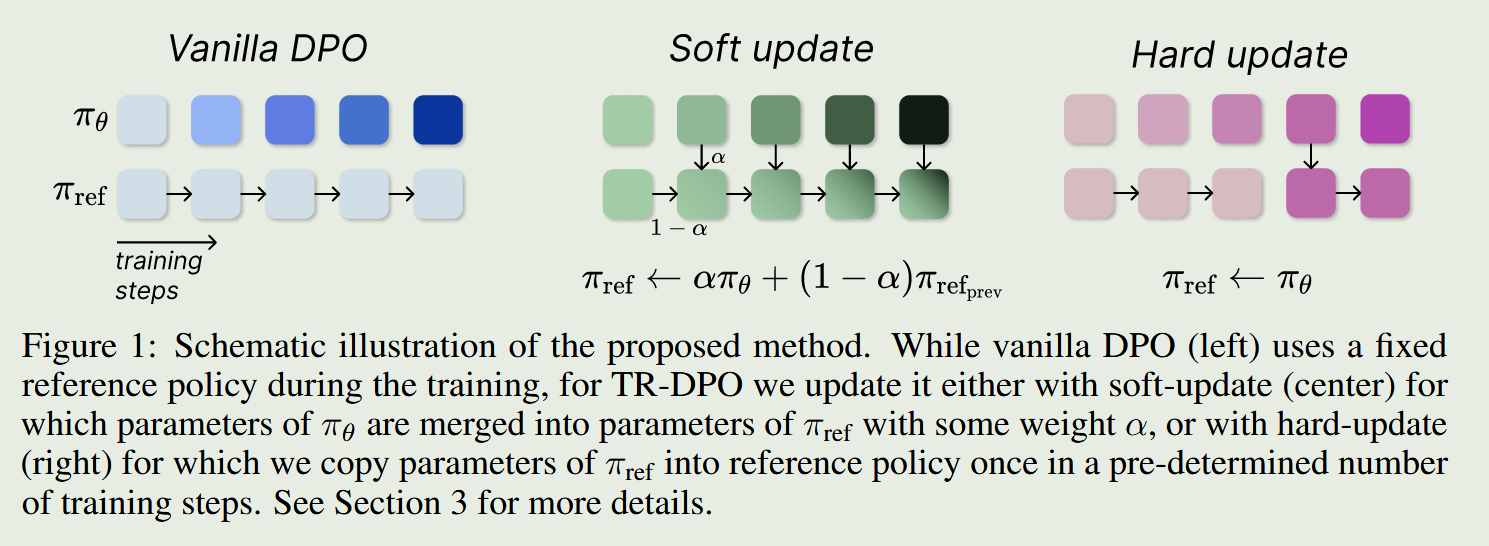 TR-DPO提出两种更新方式,一种是上次偏好训练使用的reference model和policy model的参数加权,另外一种是训练每间隔n步便强制把reference model用policy model替代